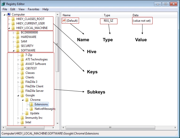 The Registry is a hierarchical database. At the top of the hierarchy is your computer. Under that, you’ll find the main branches, known as “hives” Within these hives are Registry keys. Keys can contain sub-keys and Registry values.